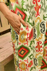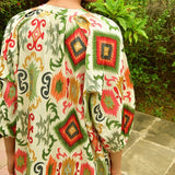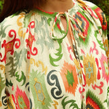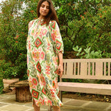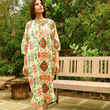 Our Mrs Kapoor Maxi is an ode to one of our favourite films “Best Exotic Marigold Hotel”, all our favourite fabrics and colourful textures of India, with beautiful colours, an effortless free-flowing style and tie neck detailing