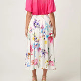 Bring effortless elegance to your wardrobe with the Pandorea Viscose Dobby Yoke Skirt in Plume Blossom. Crafted from lightweight viscose dobby, this skirt drapes beautifully with a soft, fluid movement that flatters every step. The exclusive Plume Blossom print, with its painterly florals in vibrant pops of fuchsia, blue, and lilac, creates a romantic and timeless statement piece.