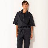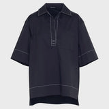This relaxed oversized shirt combines crisp stretch cotton with a classic collar and contrast topstitch detailing for a refined look. Featuring wide short sleeves that reach the elbow and a length that falls over the hips, it offers effortless comfort and style. Side splits at the hems enhance movement, making it a versatile piece for a modern wardrobe.