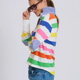 Light weight cotton jersey rugby sweatshirt with pockets. Celebrate the start of Spring with this bright and fun multi color striped dress.