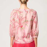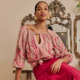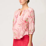 The Palmarosa print, in delicate shades of blush pink and coral, features intricate botanical motifs that bring a sense of refined artistry to your wardrobe. A keyhole neckline with a subtle loop detail adds a modern touch, while the softly gathered sleeves and elastic cuffs create gentle volume for a flattering silhouette.