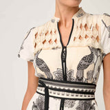The intricately printed florals and regal birds cascade effortlessly down the A-line silhouette, drawing the eye and adding artisanal flair. Thoughtfully designed with a V-neckline, soft cap sleeves, and a contrasting waistband tie, the Xanthia dress flatters the figure while remaining comfortable and breathable.
