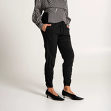 Made from our fluid stretch cupro this pant will be in your wardrobe for years. The relaxed elasticized waist and narrow ties and the slim leg with gathered ankle detail allows this pant to be worn day with flats or night with heels. The fundamental piece for your new season wardrobe.