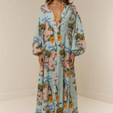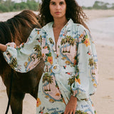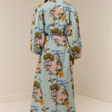 The Noddy Dress in our exclusive Palm Paradise print is crafted in a premium linen. The Noddy Dress is designed as a relaxed maxi dress silhouette. Featuring blouson sleeves with elasticated cuffs and centre front button detailing. The Noddy Dress is designed to hang loosely from the body, and has matching buckle belt to bring in the waist.