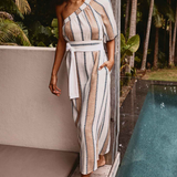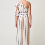 Step into effortless elegance with the Bahia Linen Viscose Dress in Cayman Stripe, a stunning statement piece designed for both comfort and style. This dress features a chic one-shoulder design with an elasticated neckline, ensuring a secure fit while adding a modern touch to your look. The elbow-length puff sleeve, complete with an elastic cuff, adds a playful yet sophisticated flair, making it perfect for any occasion. The Bahia Dress comes with a removable waist tie, allowing you to cinch your waist for a flattering silhouette or wear it loosely for a more relaxed fit. The built-in shelf bra, enhanced with elastic, offers added support and comfort, making this dress as functional as it is fashionable. Crafted from a breathable linen-viscose blend, this dress is ideal for warm-weather events, exuding effortless grace with every wear. The exclusive Wisteria Alba print adds a vibrant, feminine touch, making the Bahia Linen Viscose Dress a must-have for your seasonal wardrobe.