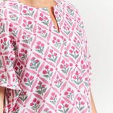 The Flora Short Kaftan boasts an all-over hand-block printed, vibrant floral design in tones of pink and teal, highlighted with white. Designed to sit below the knee with a relaxed fit and sloping neckline with a 'V' detail, the Flora Short Kaftan is perfect for days at the beach or simply wearing around the house