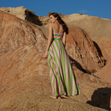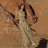 The Hazel Dress features a strapless fitted bodice that elegantly transitions into a long, flowing A-line skirt. Crafted in our exclusive Seagrass/Salmon stripe print, this dress embodies a perfect blend of sophistication and ease, making it an ideal choice for any stylish occasion.