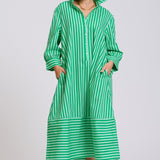 Martha, a new popover style that has it ALL. Stunning slightly puffy sleeve gathered into a bracelet length cuff. Oversized long flowing fit, with feature horizontal stripe panel at hemline. Side pockets & matching belt. Your new style staple.