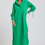 This dress is a stunning new popover style, longline with scooped side vents, feature adjustable gathered sleeves, side pockets, crafted in cotton poplin.