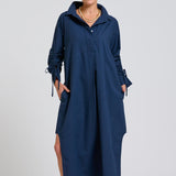 This dress is a stunning new popover style, longline with scooped side vents, feature adjustable gathered sleeves, side pockets, crafted in cotton poplin.