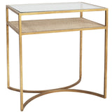 The Manhattan Glass Side Table has a Deco-inspired look with a curved Gold frame, glass top and subtle white-washed Rattan shelf.
