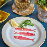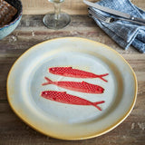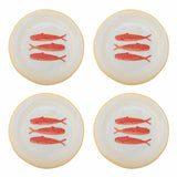 The Hadden Plate by Creative Collection is made of stoneware and features an embossed motif of three red fish at the centre. The warm golden-brown rim combined with the playful design creates a charming and lively expression. The plate comes in a set of four, and variations in the glaze make each piece unique.
