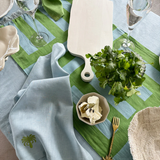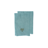 Hand dyed powder blue linen blend napkins embroidered with a contrast palm illustration. This classic napkin set contains two cloth napkins that can be paired with complimentary table linen. A refreshing garnish to the table. Practical and stylish, our cloth napkins are statement pieces that blend well with staple dinnerware.