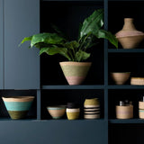 Made from a striking jute weave and intricately made, the Kamala Collection celebrates organic shapes with muted colour bands of soft pink and green.
