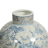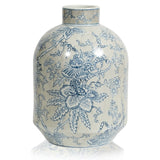 The Toile Vase Large features a stunning 'Toile de Jouy' design in blue and grey.