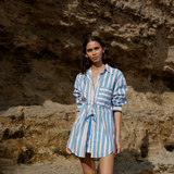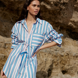 Our classic Buddy Shirt in our new Ocean Depth/Seashell stripe, featuring a stunning contrast of blue and pink for a refreshing look. This classically oversized shirt is crafted from soft cotton poplin, combining comfort with timeless style. Perfect for layering or wearing solo, the Buddy Shirt elevates any outfit effortlessly.