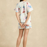 The Isla Blouse is a breezy summer staple, crafted in lightweight linen and hand printed with scattered orchid motifs in soft vanilla, blue, and red tones. Cut in a relaxed trapeze silhouette, it features a round neckline, centre front placket with functional buttons, and delicate flutter sleeves gathered softly from the neck. Finished with a clean, straight hem, it pairs perfectly with the matching Caroline Short or worn loose over linen trousers for effortless ease.