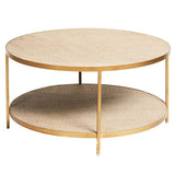 The Manhattan round coffee table has a slender Gold look iron frame with a Rattan top and bottom shelf. The Rattan is finished in a subtle white-wash, giving it a modern versatile finish.