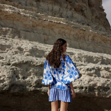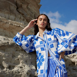 The Rafferty blouse is a striking new addition, featuring long, voluminous balloon sleeves with comfortable elastic cuffs for a touch of drama. This button-up shirt is meticulously crafted from lightweight linen, making it a breathable and stylish option for warmer days. Adorned with our exclusive Mediterranean print, it seamlessly blends bold design with an effortlessly sophisticated silhouette, perfect for elevating your summer wardrobe.